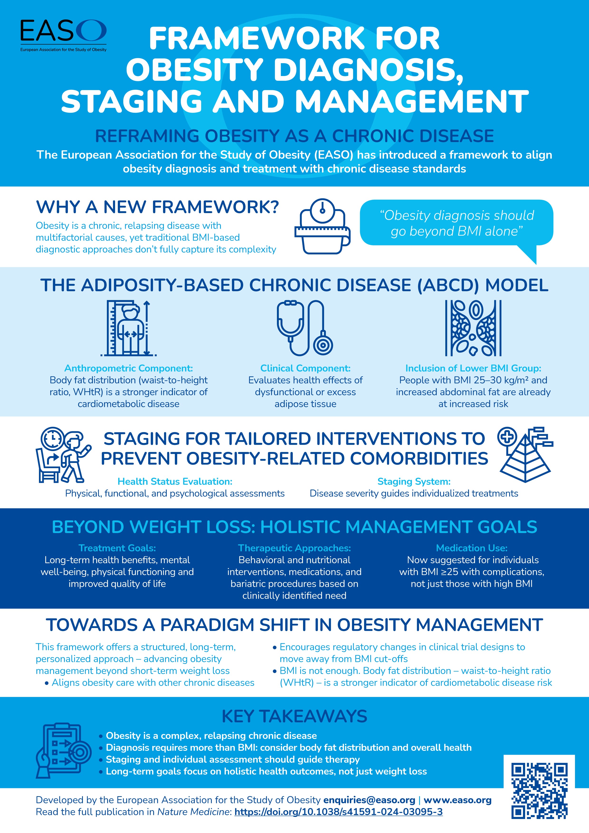 The European Association for the Study of Obesity (EASO) is pleased to present a new framework for the diagnosis, staging and management of obesity in adults to better align with the concept of obesity as an adiposity-based chronic disease.